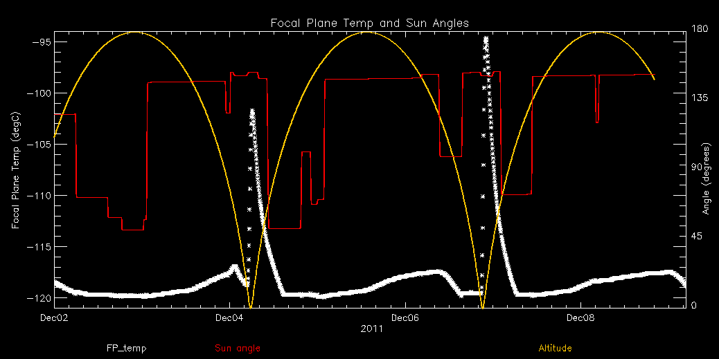 Weekly focal plane temperature with sun angle and altitude overplotted. Sun angle is the solar array angle, that is the angle between the sun and the optical axis (+X axis). Altitude varies from 5 kkm to 145 kkm.