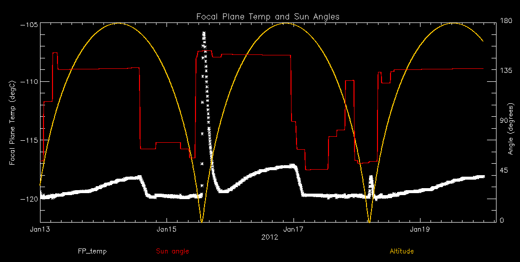 Weekly focal plane temperature with sun angle and altitude overplotted. Sun angle is the solar array angle, that is the angle between the sun and the optical axis (+X axis). Altitude varies from 5 kkm to 145 kkm.