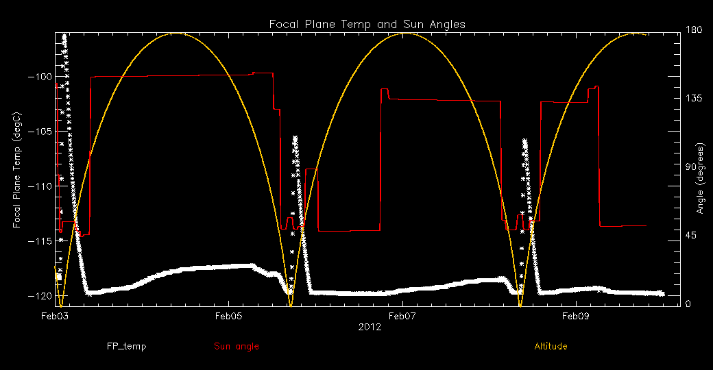 Weekly focal plane temperature with sun angle, earth angle, and altitude overplotted. Sun angle is the solar array angle, that is the angle between the sun and the optical axis (+X axis). The earth angle is the angle between earth and the ACIS radiator (+Z axis). Altitude varies from 34 kkm to 128 kkm.