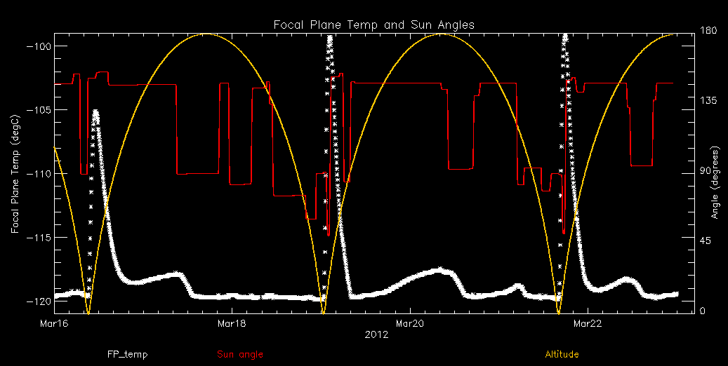 Weekly focal plane temperature with sun angle, earth angle, and altitude overplotted. Sun angle is the solar array angle, that is the angle between the sun and the optical axis (+X axis). The earth angle is the angle between earth and the ACIS radiator (+Z axis). Altitude varies from 34 kkm to 128 kkm.