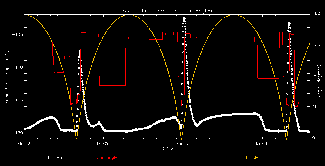Weekly focal plane temperature with sun angle and altitude overplotted. Sun angle is the solar array angle, that is the angle between the sun and the optical axis (+X axis). Altitude varies from 5 kkm to 145 kkm.