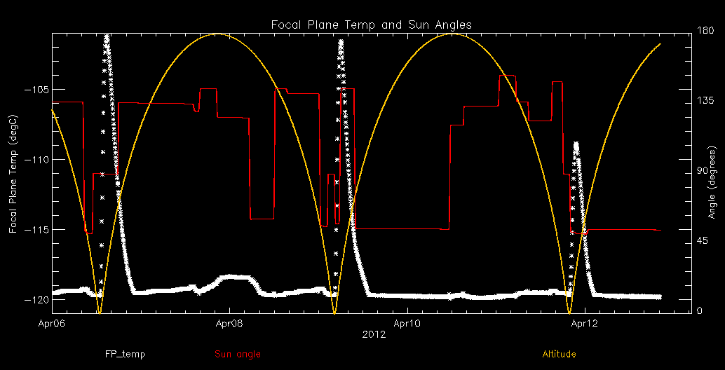 Weekly focal plane temperature with sun angle, earth angle, and altitude overplotted. Sun angle is the solar array angle, that is the angle between the sun and the optical axis (+X axis). The earth angle is the angle between earth and the ACIS radiator (+Z axis). Altitude varies from 34 kkm to 128 kkm.