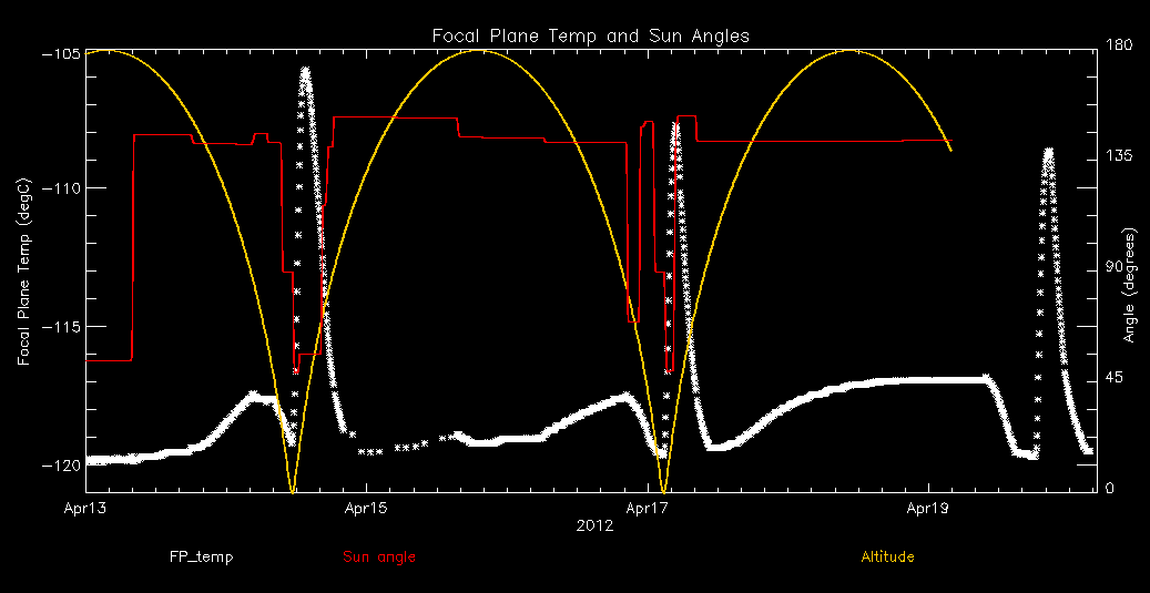 Weekly focal plane temperature with sun angle and altitude overplotted. Sun angle is the solar array angle, that is the angle between the sun and the optical axis (+X axis). Altitude varies from 5 kkm to 145 kkm.