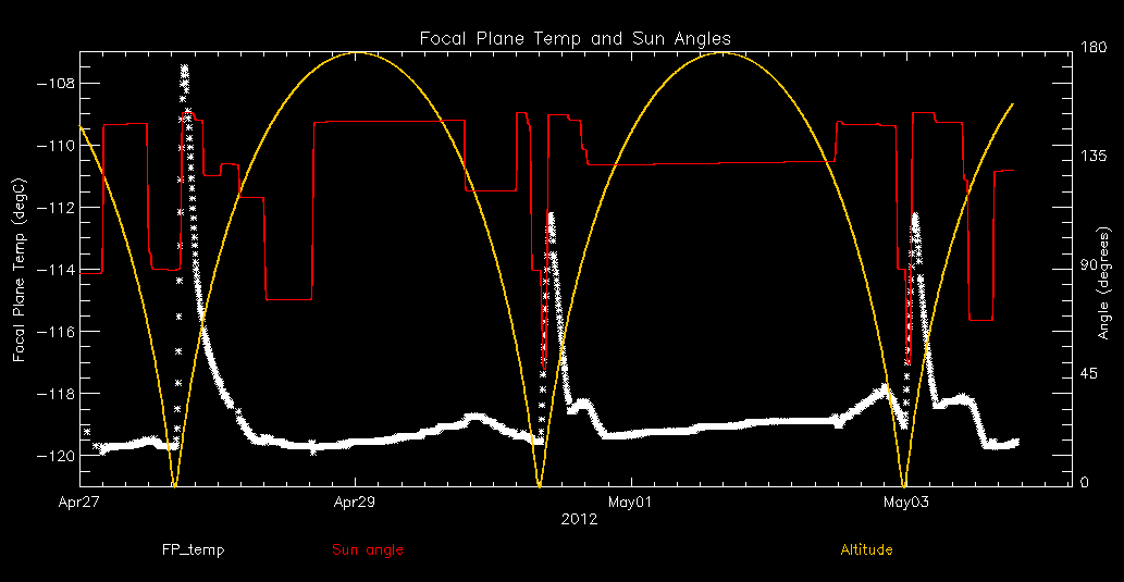 Weekly focal plane temperature with sun angle, earth angle, and altitude overplotted. Sun angle is the solar array angle, that is the angle between the sun and the optical axis (+X axis). The earth angle is the angle between earth and the ACIS radiator (+Z axis). Altitude varies from 34 kkm to 128 kkm.
