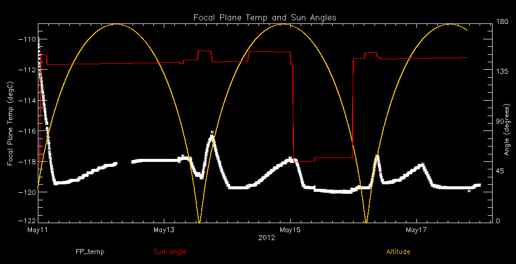 Weekly focal plane temperature with sun angle, earth angle, and altitude overplotted. Sun angle is the solar array angle, that is the angle between the sun and the optical axis (+X axis). The earth angle is the angle between earth and the ACIS radiator (+Z axis). Altitude varies from 34 kkm to 128 kkm.