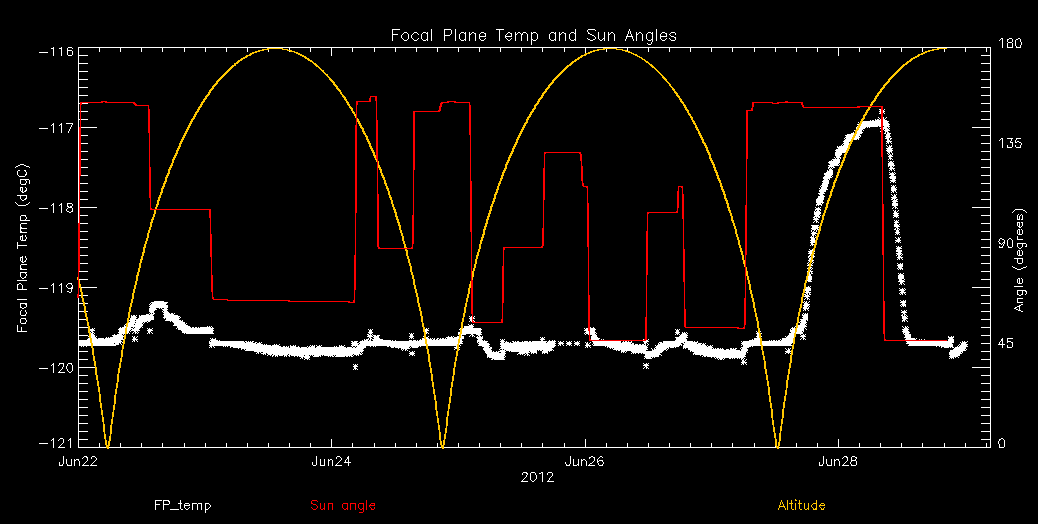 Weekly focal plane temperature with sun angle, earth angle, and altitude overplotted. Sun angle is the solar array angle, that is the angle between the sun and the optical axis (+X axis). The earth angle is the angle between earth and the ACIS radiator (+Z axis). Altitude varies from 34 kkm to 128 kkm.