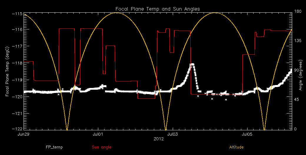 Weekly focal plane temperature with sun angle and altitude overplotted. Sun angle is the solar array angle, that is the angle between the sun and the optical axis (+X axis). Altitude varies from 5 kkm to 145 kkm.