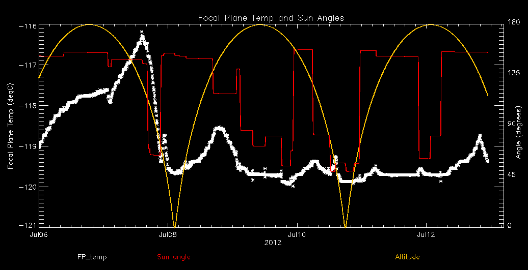 Weekly focal plane temperature with sun angle, earth angle, and altitude overplotted. Sun angle is the solar array angle, that is the angle between the sun and the optical axis (+X axis). The earth angle is the angle between earth and the ACIS radiator (+Z axis). Altitude varies from 34 kkm to 128 kkm.