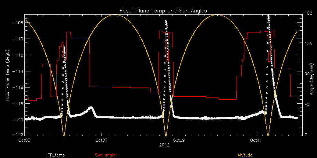 Weekly focal plane temperature with sun angle and altitude overplotted. Sun angle is the solar array angle, that is the angle between the sun and the optical axis (+X axis). Altitude varies from 5 kkm to 145 kkm.