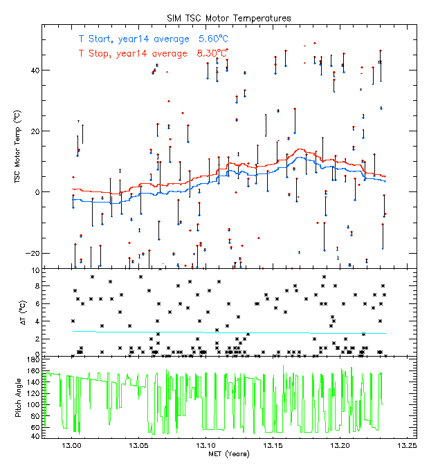 Min/max envelopes in dark blue appear on the trending plots. The envelopes are 4th degree fits to the monthly minimum and maximum values for each MSID. The final polynomial form and binning are still being experimented with. We will soon add to the trending pages a report of the fits and predictions they give on future limit violations. The light blue curve is our original smoothing of all the data over 30 day moving boxcars. The green/yellow line is a linear fit to all the data; the break occurs at a limit change.