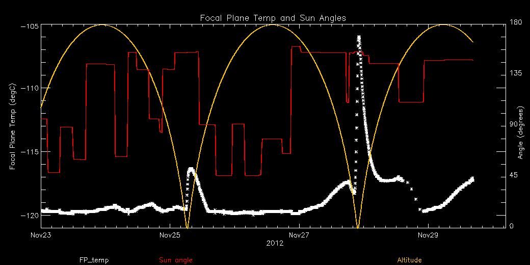Weekly focal plane temperature with sun angle, earth angle, and altitude overplotted. Sun angle is the solar array angle, that is the angle between the sun and the optical axis (+X axis). The earth angle is the angle between earth and the ACIS radiator (+Z axis). Altitude varies from 34 kkm to 128 kkm.