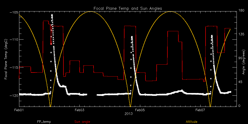 Weekly focal plane temperature with sun angle, earth angle, and altitude overplotted. Sun angle is the solar array angle, that is the angle between the sun and the optical axis (+X axis). The earth angle is the angle between earth and the ACIS radiator (+Z axis). Altitude varies from 34 kkm to 128 kkm.