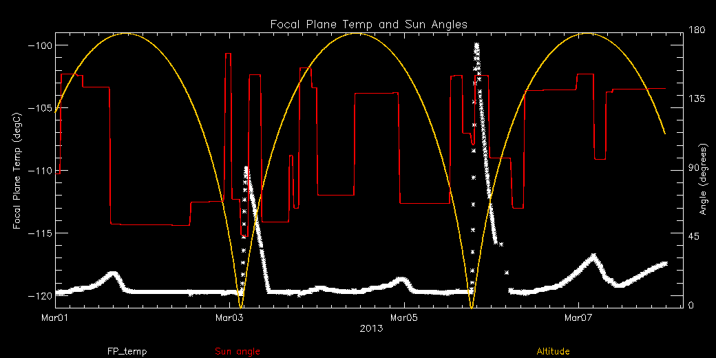 Weekly focal plane temperature with sun angle, earth angle, and altitude overplotted. Sun angle is the solar array angle, that is the angle between the sun and the optical axis (+X axis). The earth angle is the angle between earth and the ACIS radiator (+Z axis). Altitude varies from 34 kkm to 128 kkm.
