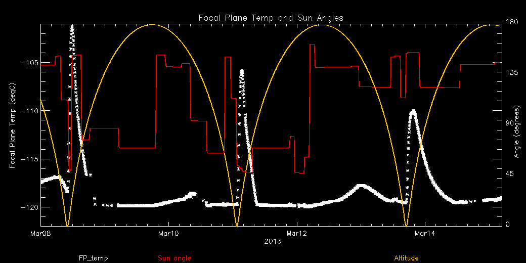 Weekly focal plane temperature with sun angle and altitude overplotted. Sun angle is the solar array angle, that is the angle between the sun and the optical axis (+X axis). Altitude varies from 5 kkm to 145 kkm.