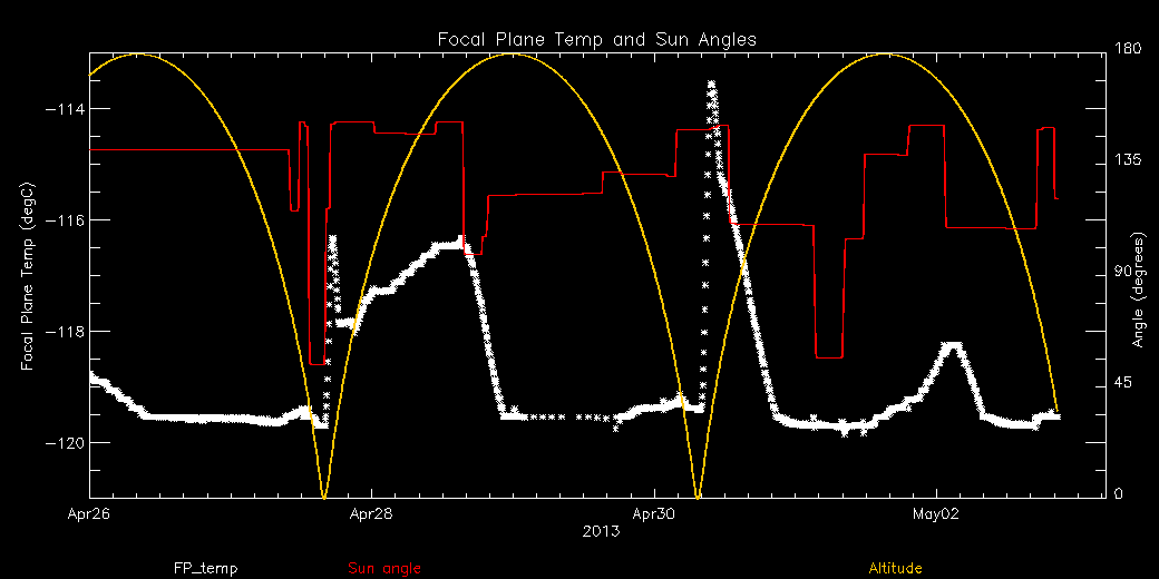 Weekly focal plane temperature with sun angle, earth angle, and altitude overplotted. Sun angle is the solar array angle, that is the angle between the sun and the optical axis (+X axis). The earth angle is the angle between earth and the ACIS radiator (+Z axis). Altitude varies from 34 kkm to 128 kkm.