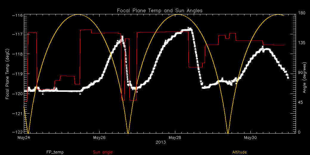 Weekly focal plane temperature with sun angle, earth angle, and altitude overplotted. Sun angle is the solar array angle, that is the angle between the sun and the optical axis (+X axis). The earth angle is the angle between earth and the ACIS radiator (+Z axis). Altitude varies from 34 kkm to 128 kkm.