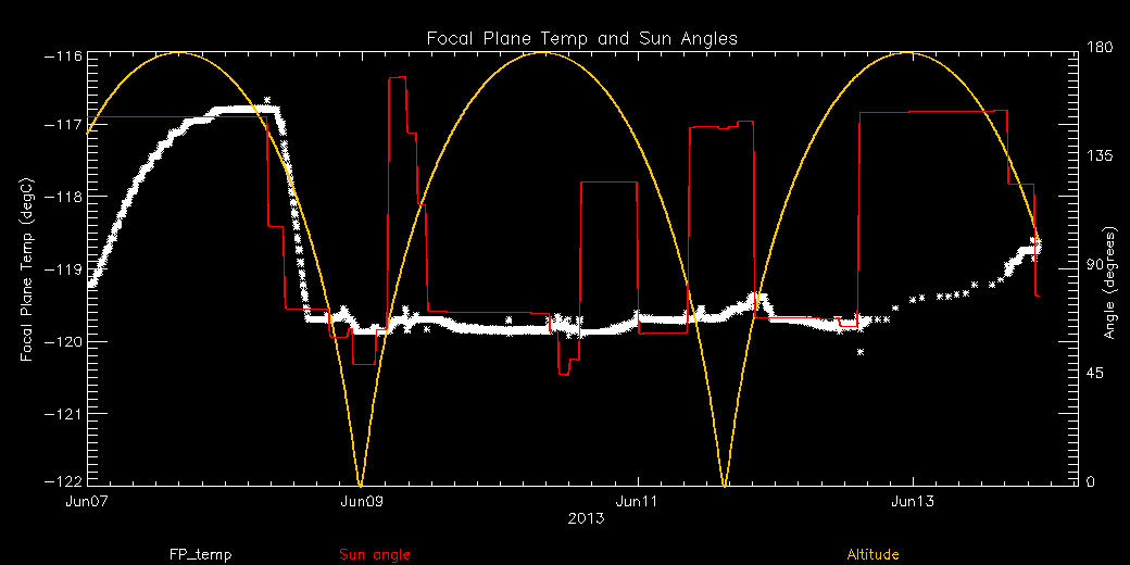 Weekly focal plane temperature with sun angle, earth angle, and altitude overplotted. Sun angle is the solar array angle, that is the angle between the sun and the optical axis (+X axis). The earth angle is the angle between earth and the ACIS radiator (+Z axis). Altitude varies from 34 kkm to 128 kkm.