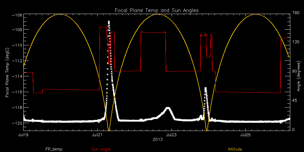 Weekly focal plane temperature with sun angle and altitude overplotted. Sun angle is the solar array angle, that is the angle between the sun and the optical axis (+X axis). Altitude varies from 5 kkm to 145 kkm.