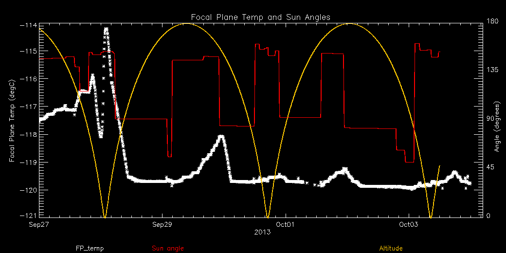 Weekly focal plane temperature with sun angle, earth angle, and altitude overplotted. Sun angle is the solar array angle, that is the angle between the sun and the optical axis (+X axis). The earth angle is the angle between earth and the ACIS radiator (+Z axis). Altitude varies from 34 kkm to 128 kkm.