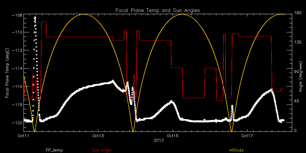 Weekly focal plane temperature with sun angle, earth angle, and altitude overplotted. Sun angle is the solar array angle, that is the angle between the sun and the optical axis (+X axis). The earth angle is the angle between earth and the ACIS radiator (+Z axis). Altitude varies from 34 kkm to 128 kkm.