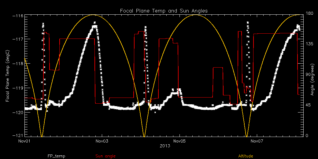 Weekly focal plane temperature with sun angle and altitude overplotted. Sun angle is the solar array angle, that is the angle between the sun and the optical axis (+X axis). Altitude varies from 5 kkm to 145 kkm.