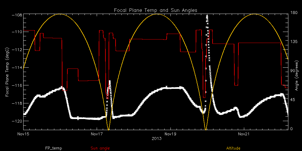 Weekly focal plane temperature with sun angle and altitude overplotted. Sun angle is the solar array angle, that is the angle between the sun and the optical axis (+X axis). Altitude varies from 5 kkm to 145 kkm.