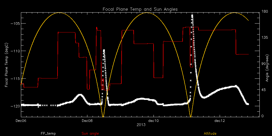 Weekly focal plane temperature with sun angle, earth angle, and altitude overplotted. Sun angle is the solar array angle, that is the angle between the sun and the optical axis (+X axis). The earth angle is the angle between earth and the ACIS radiator (+Z axis). Altitude varies from 34 kkm to 128 kkm.