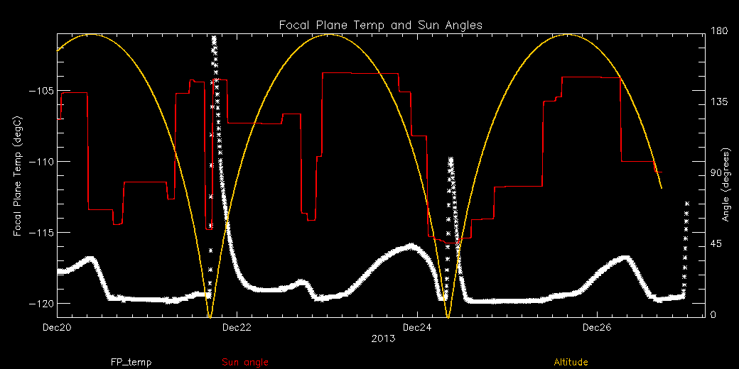 Weekly focal plane temperature with sun angle, earth angle, and altitude overplotted. Sun angle is the solar array angle, that is the angle between the sun and the optical axis (+X axis). The earth angle is the angle between earth and the ACIS radiator (+Z axis). Altitude varies from 34 kkm to 128 kkm.