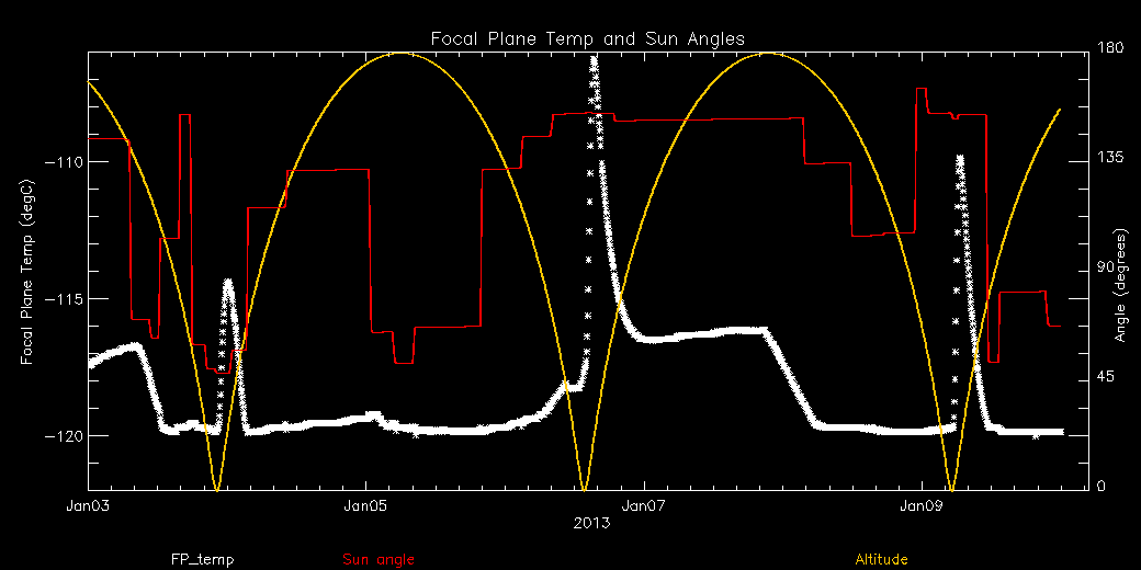 Weekly focal plane temperature with sun angle, earth angle, and altitude overplotted. Sun angle is the solar array angle, that is the angle between the sun and the optical axis (+X axis). The earth angle is the angle between earth and the ACIS radiator (+Z axis). Altitude varies from 34 kkm to 128 kkm.