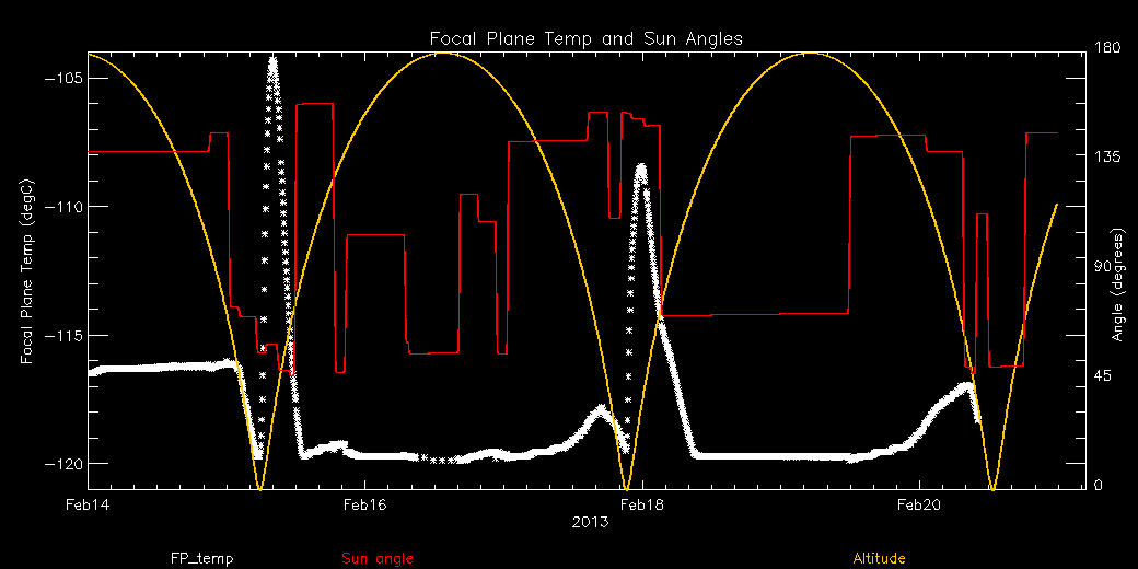 Weekly focal plane temperature with sun angle, earth angle, and altitude overplotted. Sun angle is the solar array angle, that is the angle between the sun and the optical axis (+X axis). The earth angle is the angle between earth and the ACIS radiator (+Z axis). Altitude varies from 34 kkm to 128 kkm.