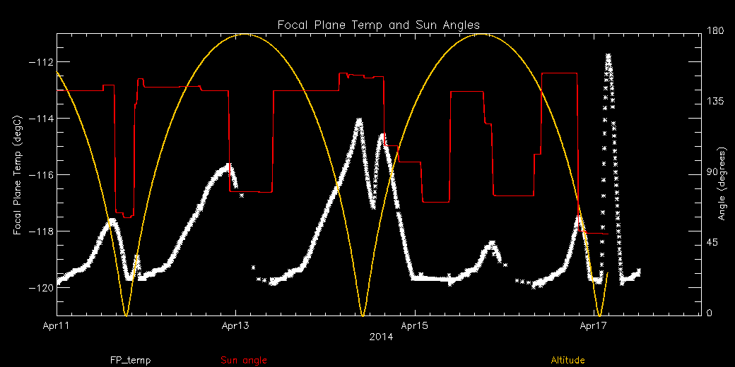 Weekly focal plane temperature with sun angle, earth angle, and altitude overplotted. Sun angle is the solar array angle, that is the angle between the sun and the optical axis (+X axis). The earth angle is the angle between earth and the ACIS radiator (+Z axis). Altitude varies from 34 kkm to 128 kkm.