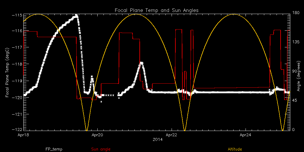 Weekly focal plane temperature with sun angle and altitude overplotted. Sun angle is the solar array angle, that is the angle between the sun and the optical axis (+X axis). Altitude varies from 5 kkm to 145 kkm.
