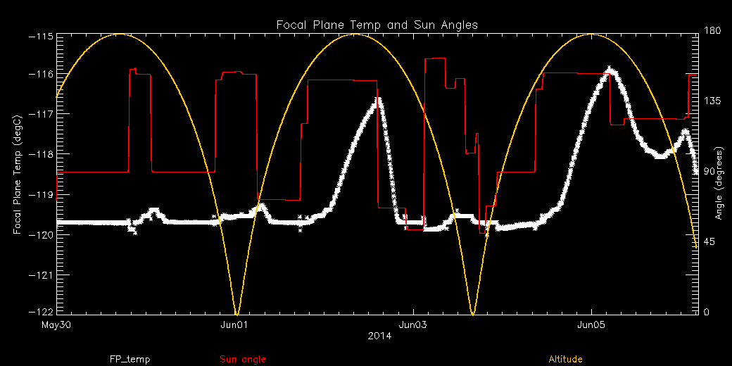 Weekly focal plane temperature with sun angle and altitude overplotted. Sun angle is the solar array angle, that is the angle between the sun and the optical axis (+X axis). Altitude varies from 5 kkm to 145 kkm.