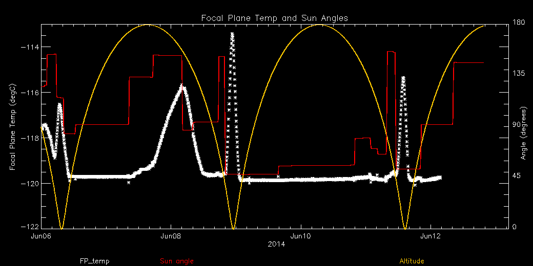Weekly focal plane temperature with sun angle, earth angle, and altitude overplotted. Sun angle is the solar array angle, that is the angle between the sun and the optical axis (+X axis). The earth angle is the angle between earth and the ACIS radiator (+Z axis). Altitude varies from 34 kkm to 128 kkm.