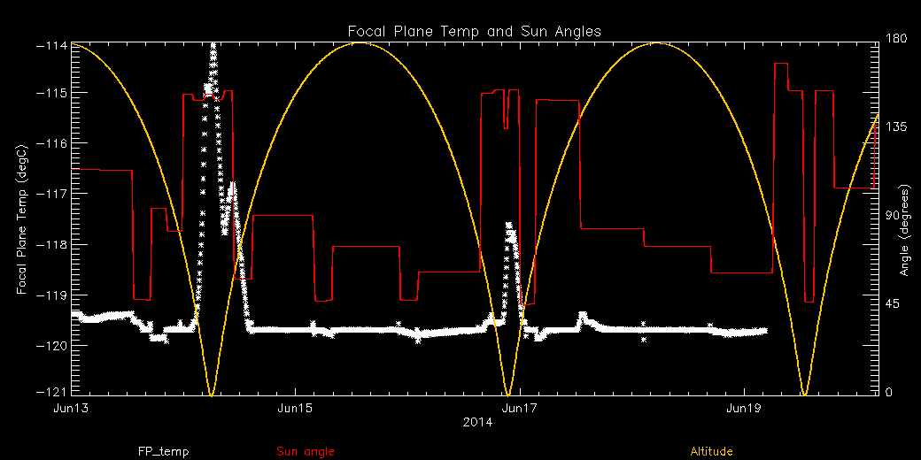 Weekly focal plane temperature with sun angle and altitude overplotted. Sun angle is the solar array angle, that is the angle between the sun and the optical axis (+X axis). Altitude varies from 5 kkm to 145 kkm.