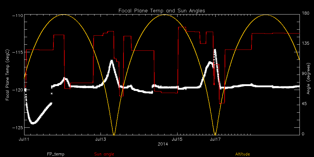 Weekly focal plane temperature with sun angle and altitude overplotted. Sun angle is the solar array angle, that is the angle between the sun and the optical axis (+X axis). Altitude varies from 5 kkm to 145 kkm.