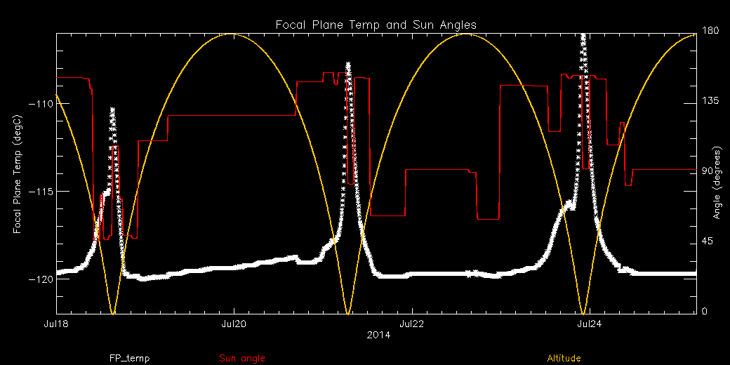 Weekly focal plane temperature with sun angle, earth angle, and altitude overplotted. Sun angle is the solar array angle, that is the angle between the sun and the optical axis (+X axis). The earth angle is the angle between earth and the ACIS radiator (+Z axis). Altitude varies from 34 kkm to 128 kkm.