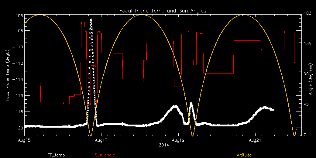 Weekly focal plane temperature with sun angle and altitude overplotted. Sun angle is the solar array angle, that is the angle between the sun and the optical axis (+X axis). Altitude varies from 5 kkm to 145 kkm.
