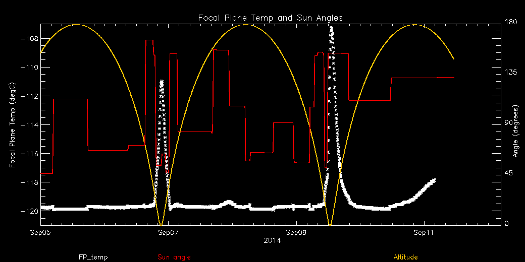 Weekly focal plane temperature with sun angle, earth angle, and altitude overplotted. Sun angle is the solar array angle, that is the angle between the sun and the optical axis (+X axis). The earth angle is the angle between earth and the ACIS radiator (+Z axis). Altitude varies from 34 kkm to 128 kkm.
