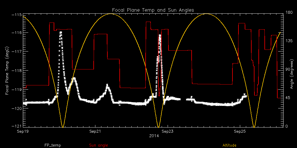Weekly focal plane temperature with sun angle and altitude overplotted. Sun angle is the solar array angle, that is the angle between the sun and the optical axis (+X axis). Altitude varies from 10 kkm to 138 kkm.