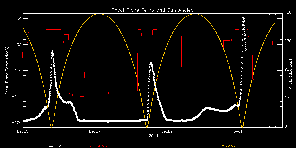 Weekly focal plane temperature with sun angle, earth angle, and altitude overplotted. Sun angle is the solar array angle, that is the angle between the sun and the optical axis (+X axis). The earth angle is the angle between earth and the ACIS radiator (+Z axis). Altitude varies from 34 kkm to 128 kkm.