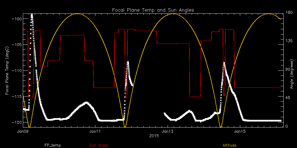 Weekly focal plane temperature with sun angle and altitude overplotted. Sun angle is the solar array angle, that is the angle between the sun and the optical axis (+X axis). Altitude varies from 11 kkm to 137 kkm.