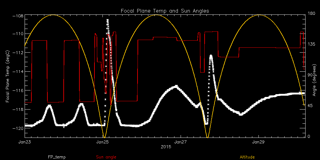 Weekly focal plane temperature with sun angle and altitude overplotted. Sun angle is the solar array angle, that is the angle between the sun and the optical axis (+X axis). Altitude varies from 10 kkm to 135 kkm.