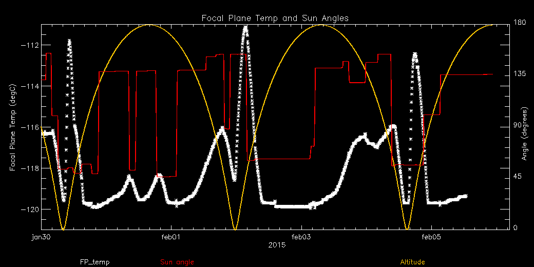 Weekly focal plane temperature with sun angle, earth angle, and altitude overplotted. Sun angle is the solar array angle, that is the angle between the sun and the optical axis (+X axis). The earth angle is the angle between earth and the ACIS radiator (+Z axis). Altitude varies from 34 kkm to 128 kkm.