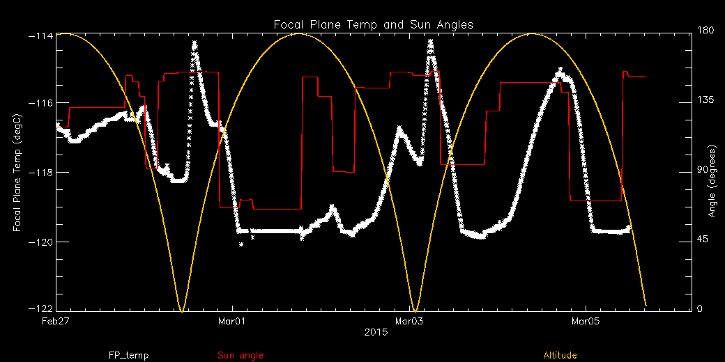 Weekly focal plane temperature with sun angle, earth angle, and altitude overplotted. Sun angle is the solar array angle, that is the angle between the sun and the optical axis (+X axis). The earth angle is the angle between earth and the ACIS radiator (+Z axis). Altitude varies from 34 kkm to 128 kkm.