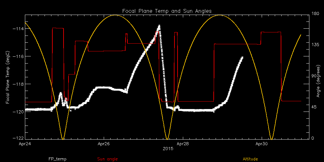Weekly focal plane temperature with sun angle, earth angle, and altitude overplotted. Sun angle is the solar array angle, that is the angle between the sun and the optical axis (+X axis). The earth angle is the angle between earth and the ACIS radiator (+Z axis). Altitude varies from 34 kkm to 128 kkm.