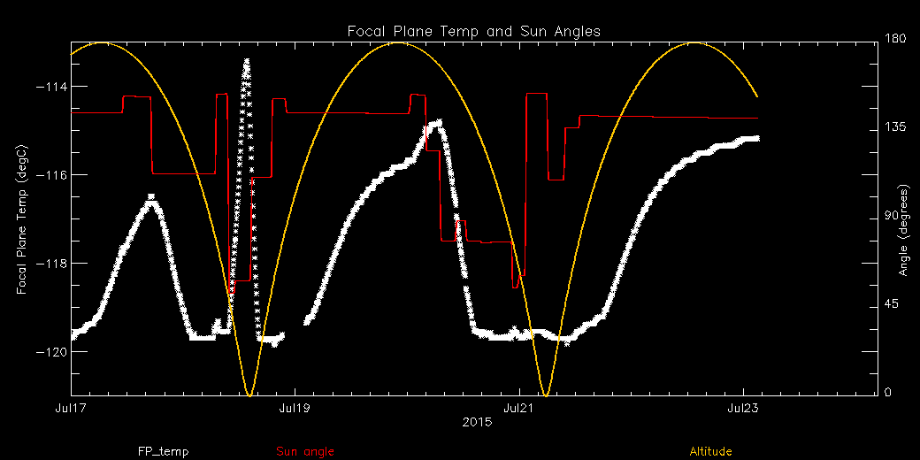 Weekly focal plane temperature with sun angle, earth angle, and altitude overplotted. Sun angle is the solar array angle, that is the angle between the sun and the optical axis (+X axis). The earth angle is the angle between earth and the ACIS radiator (+Z axis). Altitude varies from 34 kkm to 128 kkm.