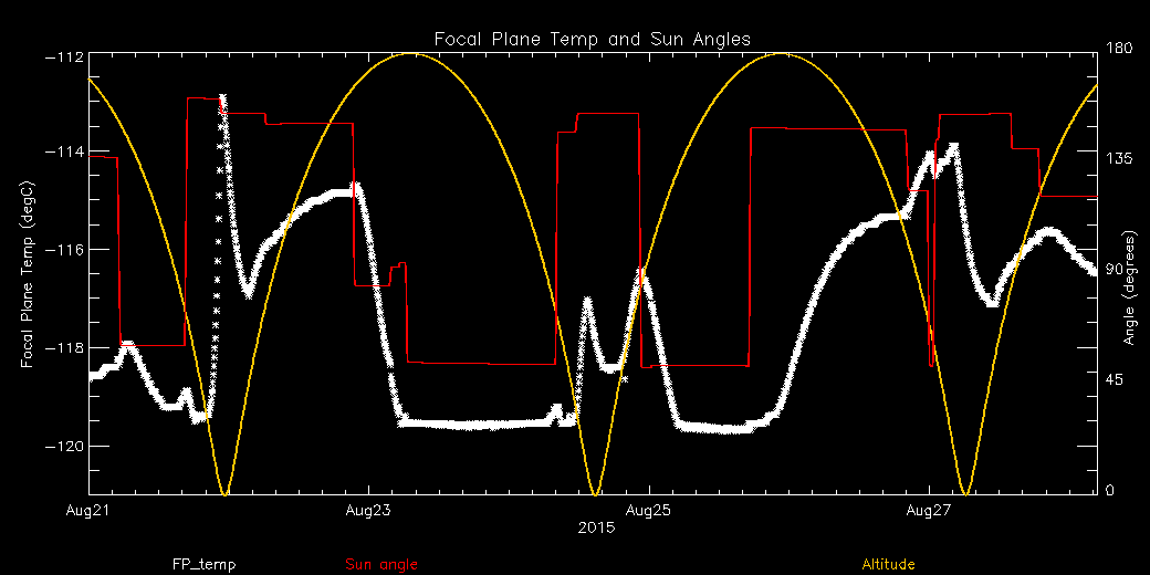 Weekly focal plane temperature with sun angle, and altitude overplotted. Sun angle is the solar array angle, that is the angle between the sun and the optical axis (+X axis). Altitude varies from 13 kkm to 135 kkm.