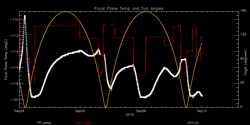 Weekly focal plane temperature with sun angle, earth angle, and altitude overplotted. Sun angle is the solar array angle, that is the angle between the sun and the optical axis (+X axis). The earth angle is the angle between earth and the ACIS radiator (+Z axis). Altitude varies from 34 kkm to 128 kkm.