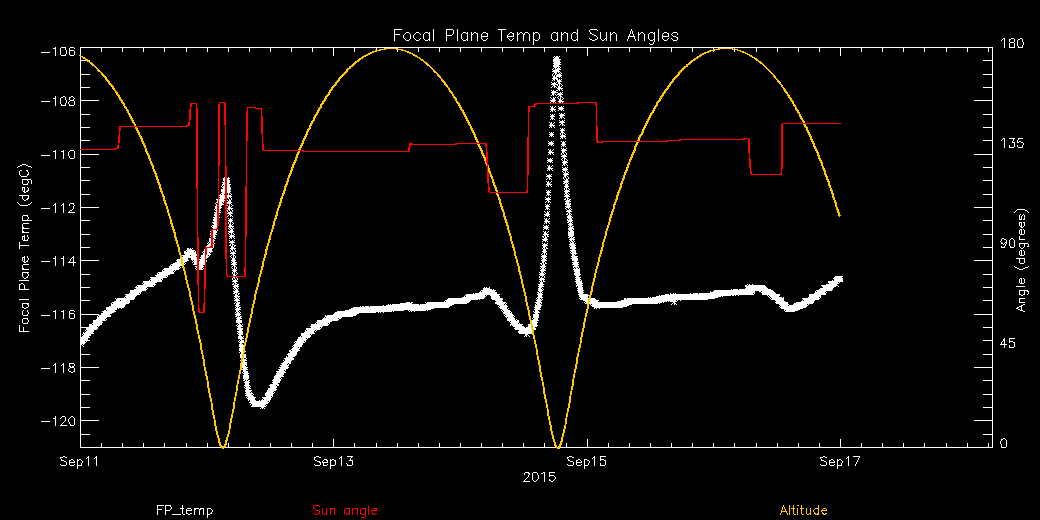 Weekly focal plane temperature with sun angle, earth angle, and altitude overplotted. Sun angle is the solar array angle, that is the angle between the sun and the optical axis (+X axis). The earth angle is the angle between earth and the ACIS radiator (+Z axis). Altitude varies from 34 kkm to 128 kkm.